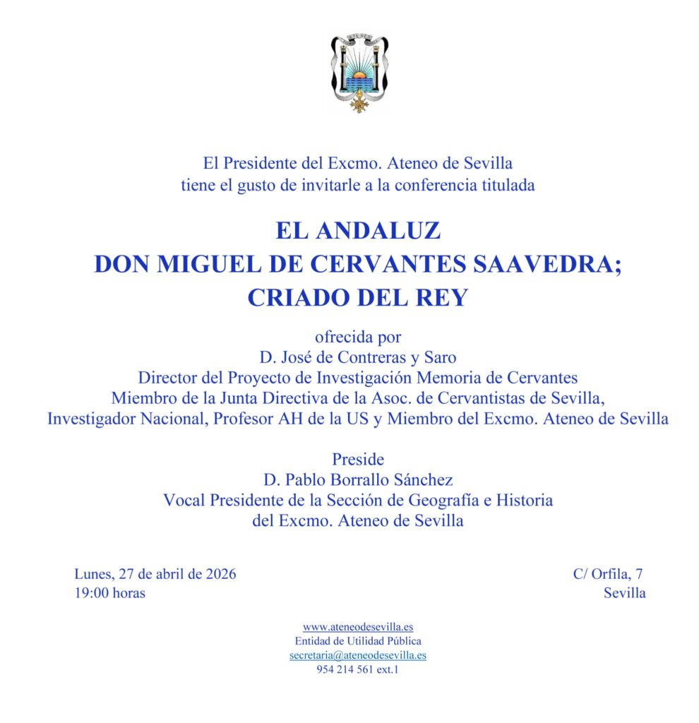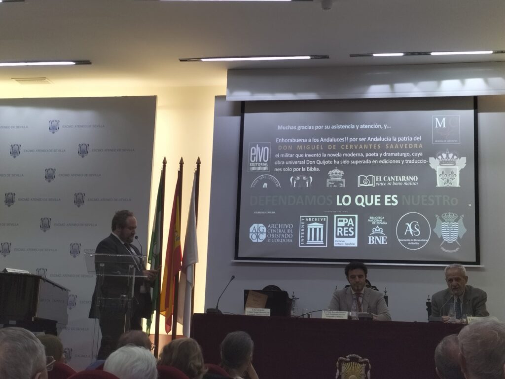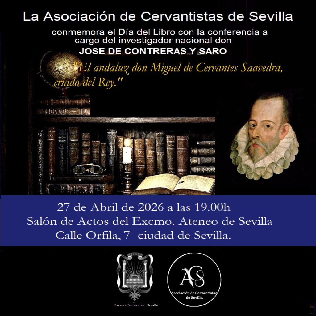 Bajo este título tan esclarecedor, don José de Contreras y Saro (investigador nacional, director del equipo de investigación Memoria de Cervantes y miembro de la Junta Directiva de la ACS) presentó en la tarde del 27 de abril, para conmemorar El día del libro 2026. El espacio no pudo ser más idóneo ya que se contó con el salón de actos del Excmo. Ateneo de Sevilla, por otra parte, sede oficial de la Asociación de Cervantistas de Sevilla.
